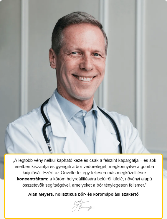 "A legtöbb vény nélkül kapható kezelés csak a felszínt érinti – és sok esetben kiszárítja és gyengíti a bőr védőrétegét, így megkönnyíti a gomba visszatérését. Ezért választottam egy teljesen más megközelítést az NORUION esetében: a köröm helyreállítása belülről kifelé, olyan növényi alapú összetevőkkel, amelyeket a bőr valóban felismer." - Alan Meyers, holisztikus bőr- és körömápolási szakértő